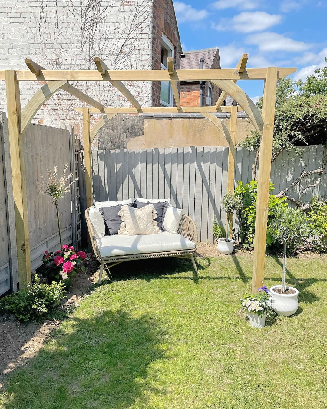 Adding a pergola to your outdoor space creates a beautiful aesthetic and provides some extra protection from the sun. It's a great way to give your garden an added touch of sophistication and style.