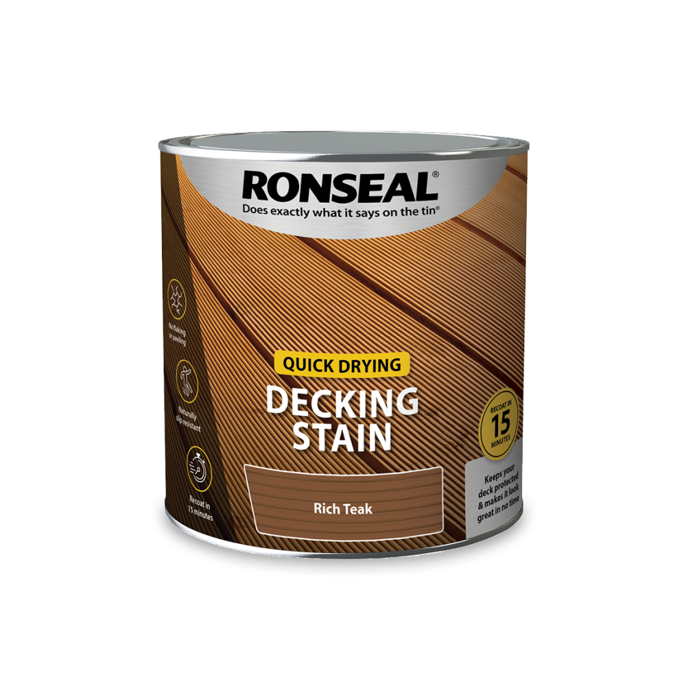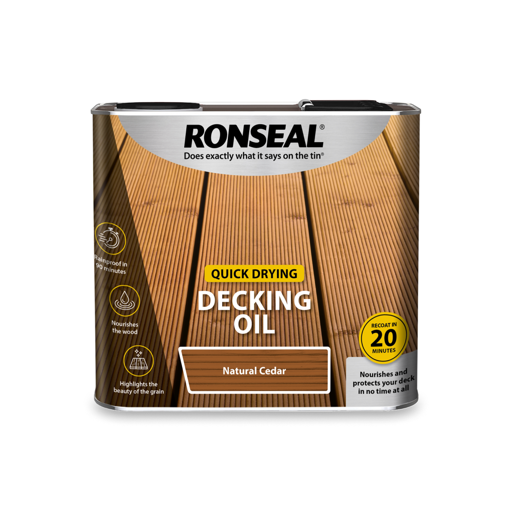 Ronseal Decking Oil provides decking with natural looking protection against the weather and foot traffic. It takes 2 hours to dry, and can be re-coated in 6 hours. If you have less time, try our Ultimate Protection Decking Oil which offers the same protection levels but is dry in just 90 minutes and can be recoated in 4 hours.